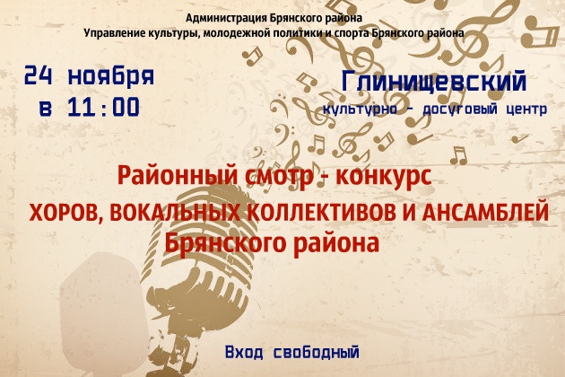 24 ноября 2018 года в 11.00 часов в Центре культуры и досуга Брянского района состоится Районный смотр-конкурс народных хоров, вокальных коллективов и ансамблей Брянского района.